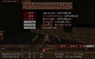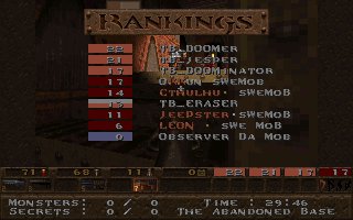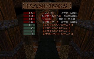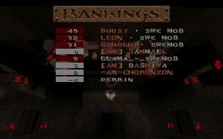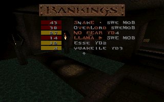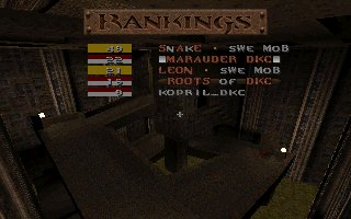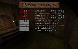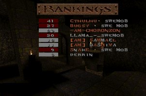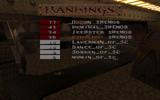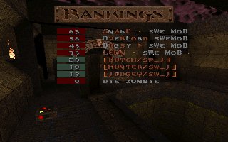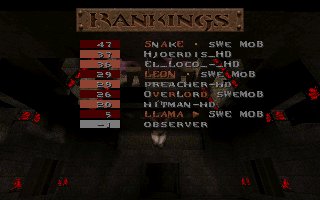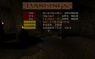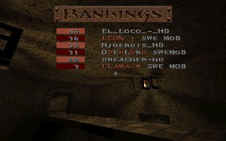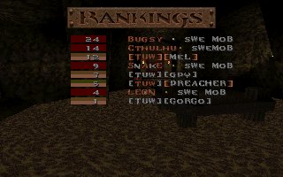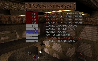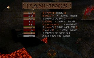 A close defeat again (the second one this week), we lost with only 11 frags mostly because Snake couldn't play all of the last half, we also missed several of our best players (OKKUN, Bugsy and Cthuhlu), especially OKKUN were missed when we meet this LPB clan (all members LPB), but OKKUN was defending da Mobs honour in Fragfest 96 in stockholm this evening and he did a great job and finished second (well done OKKUN ;-). We have added 36 frags on the second half to our score because Snake had to leave the match when 10 minutes remained and Llama stepped in as his reserv. |