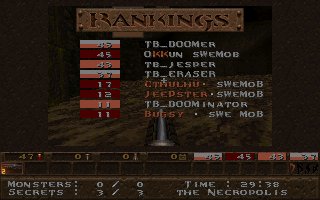 This was a modem only battle with a suprisingly strong opponent that almost beat us on our own map choice (e3m7), but then we took revenge on their choice e1m4 which is not one of our favourite maps. |