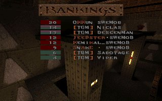 This was our first clanmatch in QuakeWorld and we had some problems with the server in the first half when the server went down after 20 minutes, so we had to reconnect and play the last 10 minutes when the server started up again. On the second half one of TCC's players left with 9 frags so we have added that to their score. Not much to say about the match in general, we played good in our mobster skin :) |