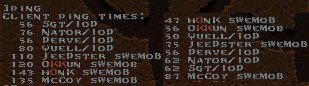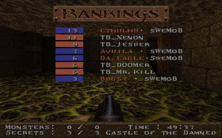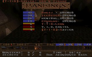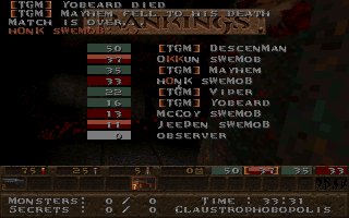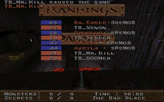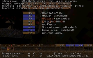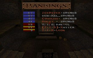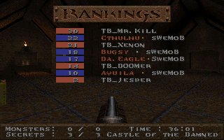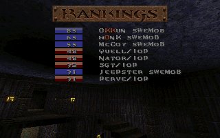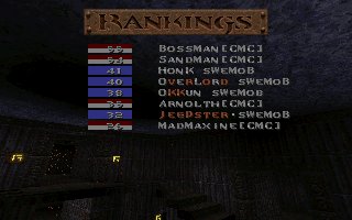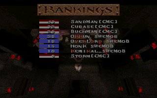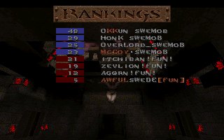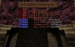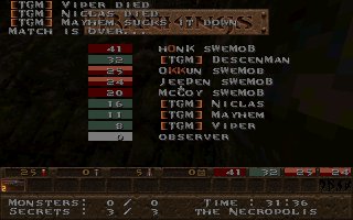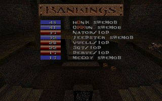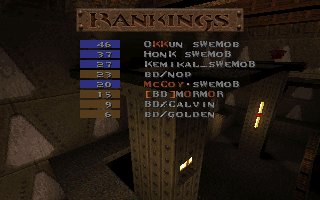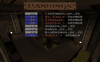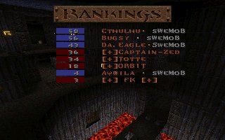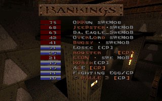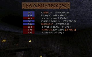 This match wasn't really planned, we had our two SQL-matches coming up.Our ping sucked royal dick! Our average was 120, theirs 46 !!! On E1M3 we played a rather tactical game.On DM2 they fragged us all over the place, pumping quad-rockets everywhere, but our margin we had made on E1M3 saved us. We finally got our revenge for our loss in the Gathering final against these very good danes. |
