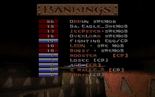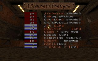 Our first match against a CTF Clan, but this was a regular dmgame. They fought good and got a lot of frags on our choice dm3 in the first half. Then we got a realy good start on the second half, but unfortunatelly someone accidently exit the map after only 10 minutes so we had to restart and play the last 20 minutes again on that map and this time they fragged us better then the first time. There will be a CTF rematch in the future and we really have to practice some CTF now, becuase these guys will be much better in CTF and we are not so good in CTF (yet!). This match was the debute for our new modemplayer Da.Eagle who did a great job of fragging our opponents all over the maps. |