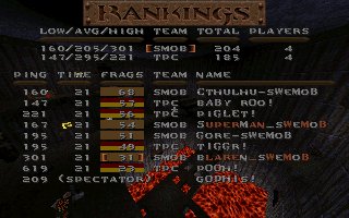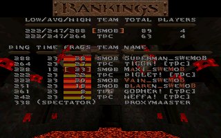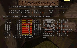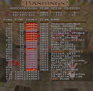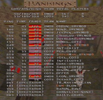 Wow, finally our 100 game, and this time we meet our opponents from our first match, COTS. We battled it out in a gigantic match on death32c, it was fun and i want to thank COTS for this great game. We finally had a mixed reuinion match with some old mobsters and some new ones. Some serverproblems and some players got dissconnected during the game, we have added 46 for cots for dissconnects, and Toshio got 68 more frags on the second half. I hope we can play these mixed games with a lot of people more in the future, it is always good for both lpbs and hpws to play together now and then. |