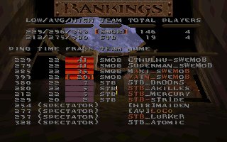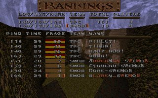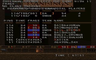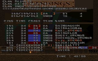 Our first match after the big splitup, when most players left da mob for a short time, now they are back and hungry for action, this time with a new addition, vains brother maximillian. This was the second meating with DA, the first one was a close match that we wone just before QSM. This time we werent that lucky, altough we lead the match when only half of the second period was left, when we suddenly lost control over our map and DA could take control over this map too and win the whole match. One reason for our lost may be that maxi was dissconnected the last 10 minutes of that half or maybe not... (we have added 10 frags for maxis dissconnection) |